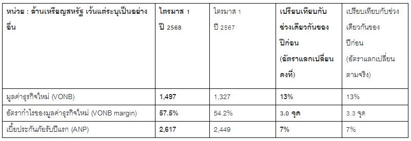 เอไอเอมีมูลค่าธุรกิจใหม่ (VONB) เพิ่มขึ้นร้อยละ 13 คิดเป็นมูลค่า 1,497 ล้านเหรียญสหรัฐในไตรมาสที่ 1 ของปี 2568 โดยมีผลมาจากทั้งช่องทางตัวแทนและช่องทางพันธมิตรธุรกิจของเรา