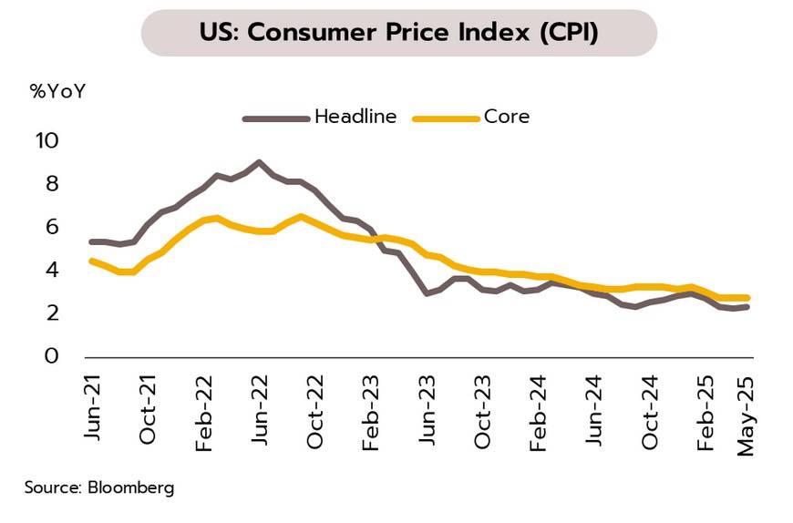 แม้สหรัฐฯ และจีนบรรลุข้อตกลงการค้าเบื้องต้น แต่ผลจากมาตรการภาษีนำเข้าจะยังคงกดดันเศรษฐกิจสหรัฐฯ อัตราเงินเฟ้อทั่วไปในเดือนพฤษภาคม ขยับขึ้นเล็กน้อยสู่ 2.4% YoY จากเดือนก่อนที่ 2.3% อัตราเงินเฟ้อพื้นฐานทรงตัวที่ 2.8% ส่วนความเชื่อมั่นผู้บริโภคเดือนมิถุนายนเพิ่มขึ้นสู่ 60.5 จาก 52.2