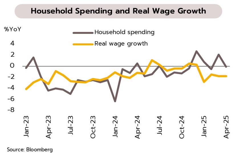 การลดลงอย่างต่อเนื่องของดัชนีความเชื่อมั่นผู้บริโภคบ่งชี้ถึงสัญญาณเชิงลบต่อแนวโน้มการใช้จ่ายภายในประเทศ เมื่อพิจารณาร่วมกับดัชนีการบริโภคภาคเอกชน (PCI) ซึ่งธปท. รายงานว่าในเดือนเมษายนหดตัวเป็นครั้งแรกในรอบ 16 เดือน ที่ -4.0% YoY สะท้อนถึงการบริโภคที่อาจถูกกดดันจากหลายปัจจัย อาทิ รายได้ฟื้นตัวช้า ภาระหนี้ครัวเรือนสูง รวมทั้งนโยบายการค้าของสหรัฐฯ ที่อาจกระทบต่อภาคการผลิตและการจ้างงาน ส่วนการเจรจาการค้าระหว่างไทยกับสหรัฐฯ เริ่มมีความคืบหน้าแต่ยังอยู่ในช่วงเริ่มต้นและจำเป็นต้องติดตามอย่างใกล้ชิด ขณะเดียวกันมาตรการกระตุ้นเศรษฐกิจวงเงิน 1.57 แสนล้านบาท ซึ่งกำลังอยู่ระหว่างการพิจารณาของรัฐบาล หากมีความล่าช้า อาจลดทอนประสิทธิภาพในการกระตุ้นอุปสงค์ในประเทศ โดยเฉพาะในช่วงครึ่งหลังของปีที่ภาวะเศรษฐกิจมีแนวโน้มชะลอตัวรุนแรงขึ้น