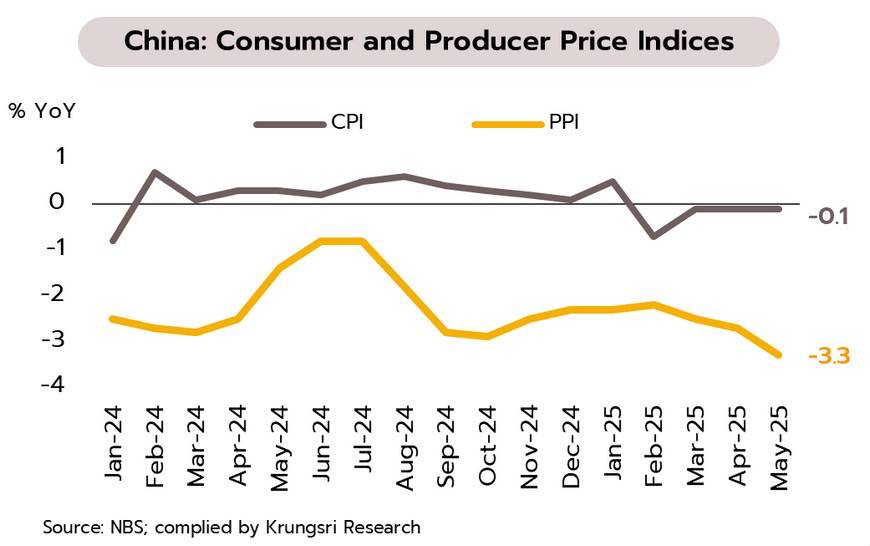 เศรษฐกิจจีนเผชิญแรงกดดันจากภายในและภายนอกต่อเนื่อง อัตราเงินเฟ้อทั่วไปยังต่ำกว่า 1% YoY ติดต่อกัน 27 เดือน ส่วนดัชนีราคาผู้ผลิตติดลบแรงขึ้นจาก -2.7% ในเดือนเมษายนเป็น -3.3% ในเดือนพฤษภาคม โดยติดลบนานกว่า 30 เดือน อีกด้านหนึ่ง การส่งออกรวมขยายตัวชะลอลงจาก 8.1% เป็น 4.8% ขณะที่การส่งออกไปยังสหรัฐฯ หดตัวแรงขึ้นจาก -21% เป็น -34.5%