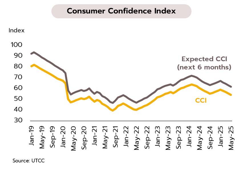 ความเชื่อมั่นผู้บริโภคเดือนพฤษภาคมร่วงต่ำสุดในรอบกว่า 2 ปี ขณะที่ทางการกำลังพิจารณามาตรการกระตุ้นเศรษฐกิจ ดัชนีความเชื่อมั่นผู้บริโภคเดือนพฤษภาคมลดลงต่อเนื่องเป็นเดือนที่ 4 สู่ระดับต่ำสุดนับตั้งแต่เดือนเมษายน 2566 ที่ 54.2 จาก 55.4 ในเดือนเมษายน เนื่องจากความกังวลเกี่ยวกับ (i) การชะลอตัวของเศรษฐกิจไทย หลังหมดมาตรการกระตุ้นในไตรมาสแรก (ii) ความเสี่ยงจากนโยบายการขึ้นภาษีนำเข้าของสหรัฐฯ และ (iii) ความไม่แน่นอนของสถานการณ์การเมืองในประเทศ