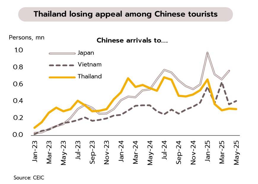 การฟื้นตัวของภาคท่องเที่ยวยังมีสถานการณ์ที่น่ากังวล ล่าสุดจำนวนนักท่องเที่ยวจีนหล่นมาอยู่อันดับ 2 รองจากมาเลเซีย โดยปัจจัยที่เป็นอุปสรรคต่อการฟื้นตัวของตลาดจีน ได้แก่ ความเชื่อมั่นด้านความปลอดภัย และการแข่งขันกับตลาดท่องเที่ยวประเทศอื่นๆ สถานการณ์นี้อาจกลายเป็นความเสี่ยงเชิงโครงสร้าง เนื่องจากตลาดนักท่องเที่ยวจีนเคยมีสัดส่วนสูงเป็นอันดับหนึ่งและสร้างรายได้จำนวนมากถึง 28% ของรายได้รวมจากนักท่องเที่ยวต่างชาติในช่วงก่อนโควิด-19 เทียบกับปัจจุบันซึ่งมีสัดส่วนเพียง 17% ในเดือนพฤษภาคม หากไม่สามารถเร่งฟื้นความเชื่อมั่นและพลิกฟื้นการเติบโต ภาคการท่องเที่ยวอาจไม่สามารถรักษาบทบาทการเป็นเครื่องยนต์หลักในการขับเคลื่อนเศรษฐกิจไทยได้