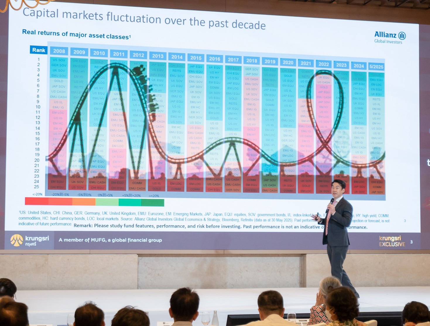 ผู้เชี่ยวชาญจาก Allianz Global Investors ได้ฉายภาพตลาดหุ้นที่มีความผันผวนอย่างต่อเนื่องตลอดทศวรรษที่ผ่านมา โดยความผันผวนในปัจจุบันมีสาเหตุหลักจากนโยบายของสหรัฐฯ ซึ่งนับเป็นปัจจัยที่ทำให้เกิดความผันผวนสูงเป็นอันดับสองรองจากช่วง COVID-19 ทำให้เกิดความกังวลต่อเศรษฐกิจสหรัฐฯ สะท้อนผ่านการคาดการณ์ GDP ที่ถูกปรับลง ขณะที่คาดการณ์เงินเฟ้อสหรัฐฯ ถูกปรับขึ้น อย่างไรก็ตามสหรัฐฯ ยังมีความน่าสนใจในแง่ของคุณภาพของบริษัทที่มีการเติบโตโดดเด่นในระยะยาว ทั้งนี้ ยังได้แนะนำให้กระจายความเสี่ยงโดยลงทุนในยุโรป ซึ่งได้ประโยชน์จากนโยบายการคลังที่กระตุ้นเศรษฐกิจ รวมถึงแนะนำการลงทุนในตราสารหนี้ซึ่งได้ประโยชน์จากนโยบายการเงินแบบผ่อนคลายต่อเนื่อง ส่วนทองคำยังคงได้รับแรงหนุนจากการซื้อของธนาคารกลางประเทศกำลังพัฒนา โดยมองกลยุทธ์การลงทุนแบบ Core & Satellite ที่กระจายการลงทุนทั้งในแง่สินทรัพย์และภูมิภาคเป็นกลยุทธ์สำคัญในช่วงนี้