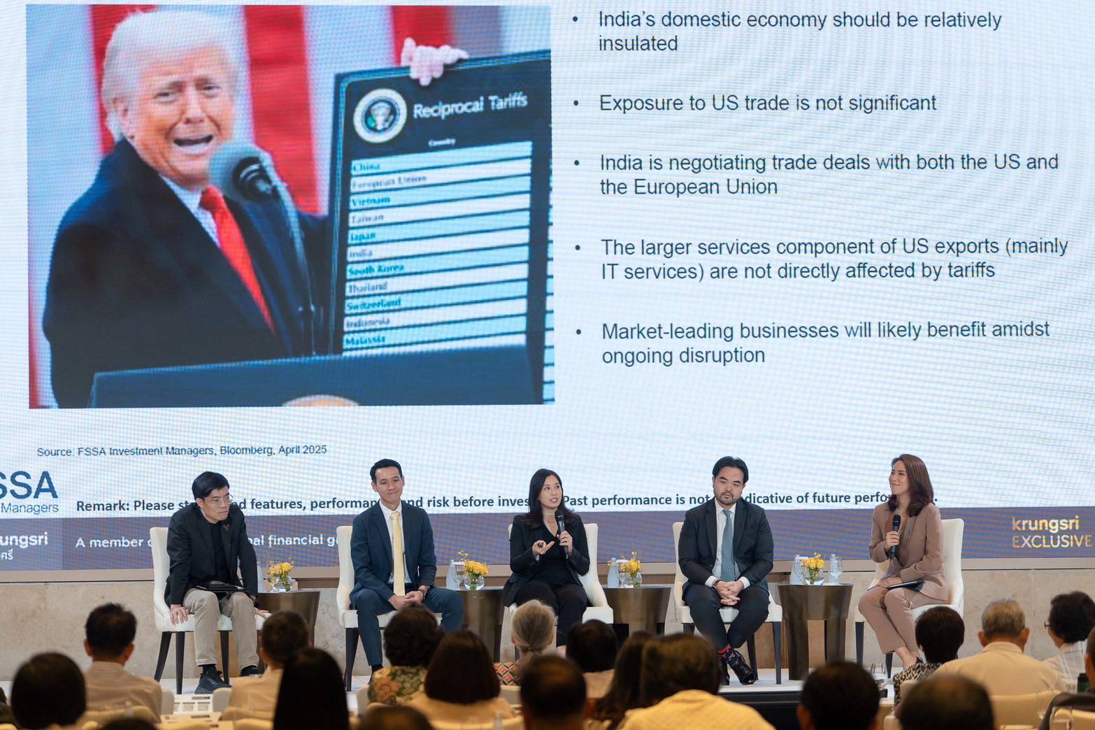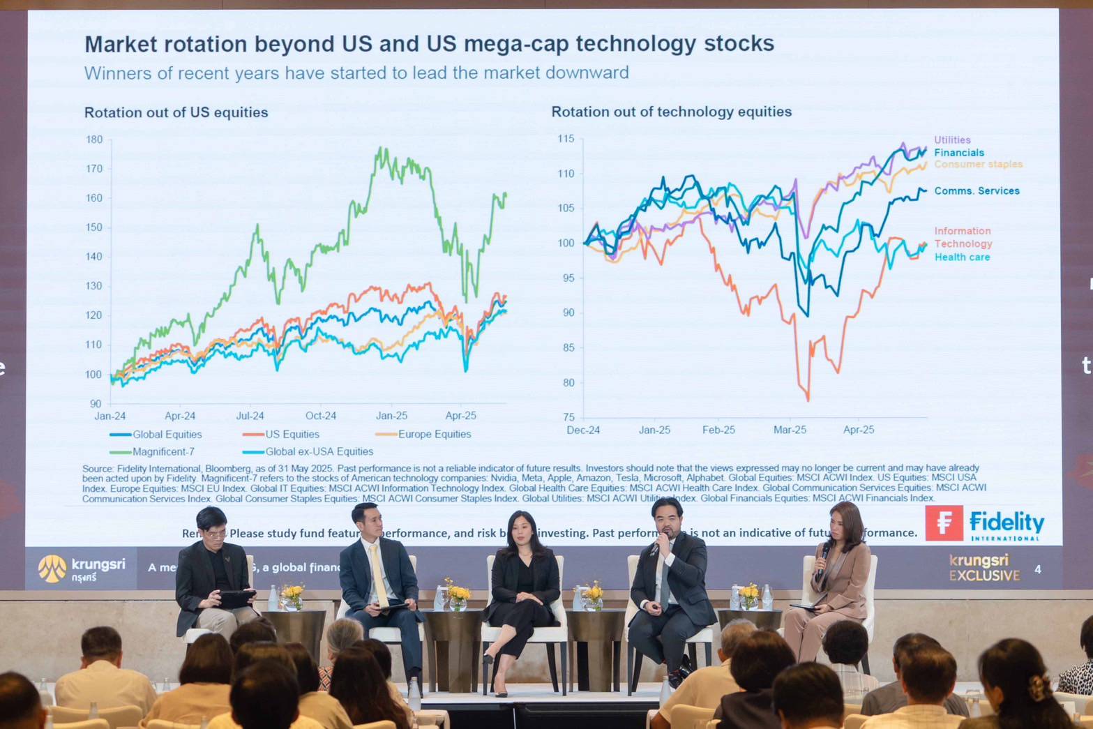 ในช่วงเสวนากลุ่ม นายวิรัตน์ วิทยศรีธาดา, CFA, Head of Krungsri Investment Intelligence Office พร้อมด้วยผู้เชี่ยวชาญด้านการลงทุนจาก 4 บริษัทหลักทรัพย์จัดการกองทุนระดับโลก ได้แก่ Allianz Global Investors, First Sentier Investors, Schroders, Fidelity International และนายทิวา ชินธาดาพงศ์ นายกสมาคมนักลงทุนประเทศไทย ร่วมแลกเปลี่ยนมุมมองต่อการลงทุนในหลากหลายภูมิภาคและสินทรัพย์ทั่วโลก โดยเฉพาะในส่วนของ Satellite Portfolio ที่เน้นการลงทุนในสินทรัพย์ที่มีโอกาสเติบโตสูงและมีความเสี่ยงที่สูงกว่าพอร์ตหลัก เริ่มจากมุมมองตลาดหุ้นยุโรป ซึ่งเคยตามหลังตลาดสหรัฐฯ มาระยะหนึ่ง แต่กลับมาโดดเด่นหลังการเลือกตั้งสหรัฐฯ เนื่องจากนักลงทุนหันกลับมาให้ความสำคัญกับมูลค่าตามปัจจัยพื้นฐานมากขึ้น นอกจากนี้โครงสร้างตลาดหุ้นยุโรปมีความกระจายตัวในหลายกลุ่มมากกว่า เมื่อเทียบกับหุ้นสหรัฐฯ ที่กระจุกในหุ้นกลุ่มเทคโนโลยีขนาดใหญ่ (Magnificent 7)
