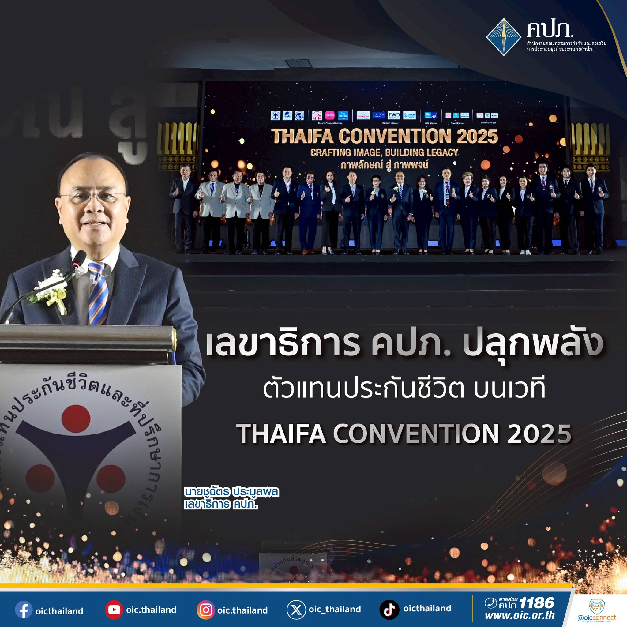เลขาธิการ คปภ. ปลุกพลังตัวแทนประกันชีวิต บนเวที THAIFA CONVENTION 2025 จุดประกายภาพพจน์ใหม่ ในอุตสาหกรรมประกันชีวิตไทย เน้นบทบาทสำคัญของตัวแทนยุคใหม่ในการสร้างภาพพจน์ความเป็นมืออาชีพ หวังสร้างรากฐานความเชื่อมั่น พร้อมผลักดันธุรกิจประกันชีวิตเติบโตอย่างยั่งยืน