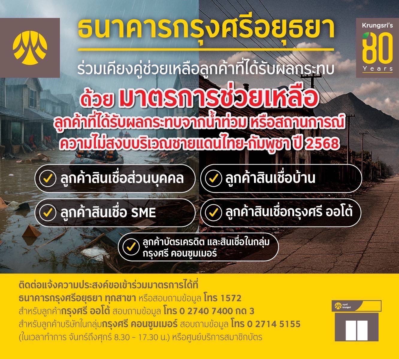 กรุงเทพฯ (26 กรกฎาคม 2568) – กรุงศรี (ธนาคารกรุงศรีอยุธยา จำกัด (มหาชน) และบริษัทในเครือ) ออกมาตรการเร่งด่วนเพื่อช่วยเหลือลูกค้ากรุงศรี ครอบคลุมทั้งลูกค้าบุคคล และลูกค้าธุรกิจ SME ที่ได้รับผลกระทบจากสถานการณ์อุทกภัยฉับพลันจากอิทธิพลของพายุโซนร้อนวิภา และสถานการณ์ความไม่สงบบริเวณชายแดน