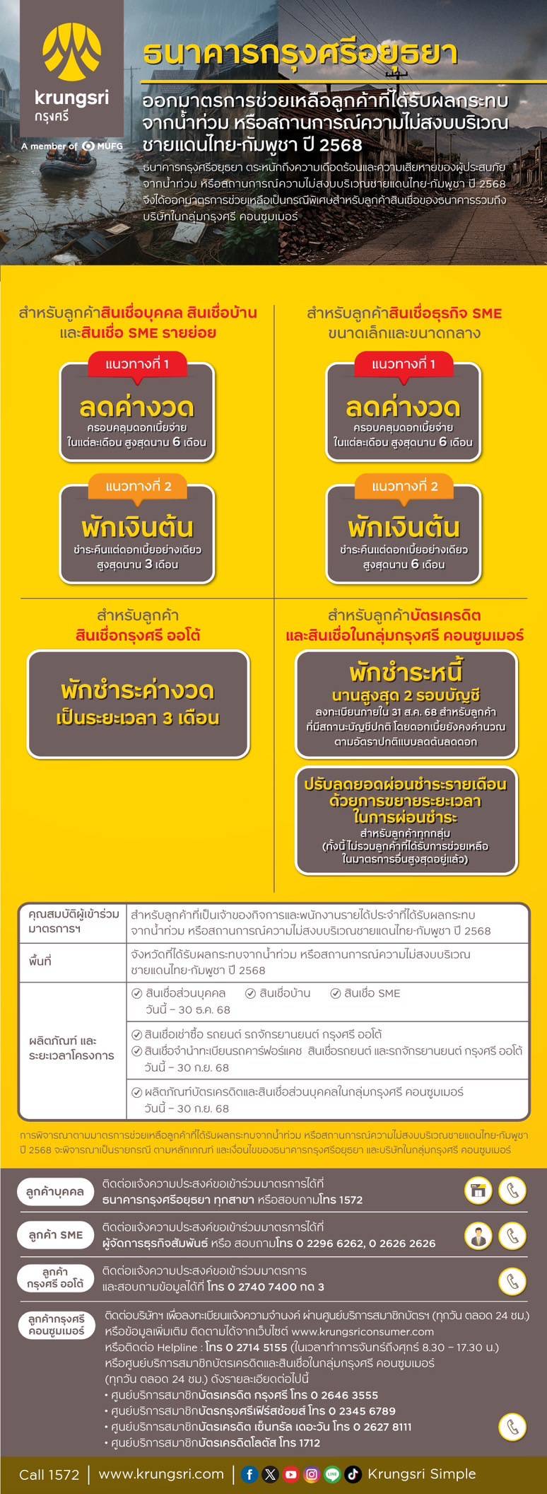 ทั้งนี้ ลูกค้าซึ่งประสงค์จะขอรับความช่วยเหลือจากโครงการดังกล่าว สามารถติดต่อมายังบริษัทฯ เพื่อลงทะเบียนแจ้งความจำนงภายใน 31 สิงหาคม 2568 ผ่านทางศูนย์บริการสมาชิกบัตรเครดิตและสินเชื่อในกลุ่มกรุงศรีคอนซูมเมอร์ (ทุกวัน ตลอด 24 ชม.) หรือ Helpline : 02-714-5155 (ในเวลาทำการ จันทร์ถึงศุกร์ 8.30 – 17.30 น.) และจะได้รับการพิจารณาเป็นรายกรณี (การพิจารณาเป็นไปตามหลักเกณฑ์และเงื่อนไขของบริษัท)