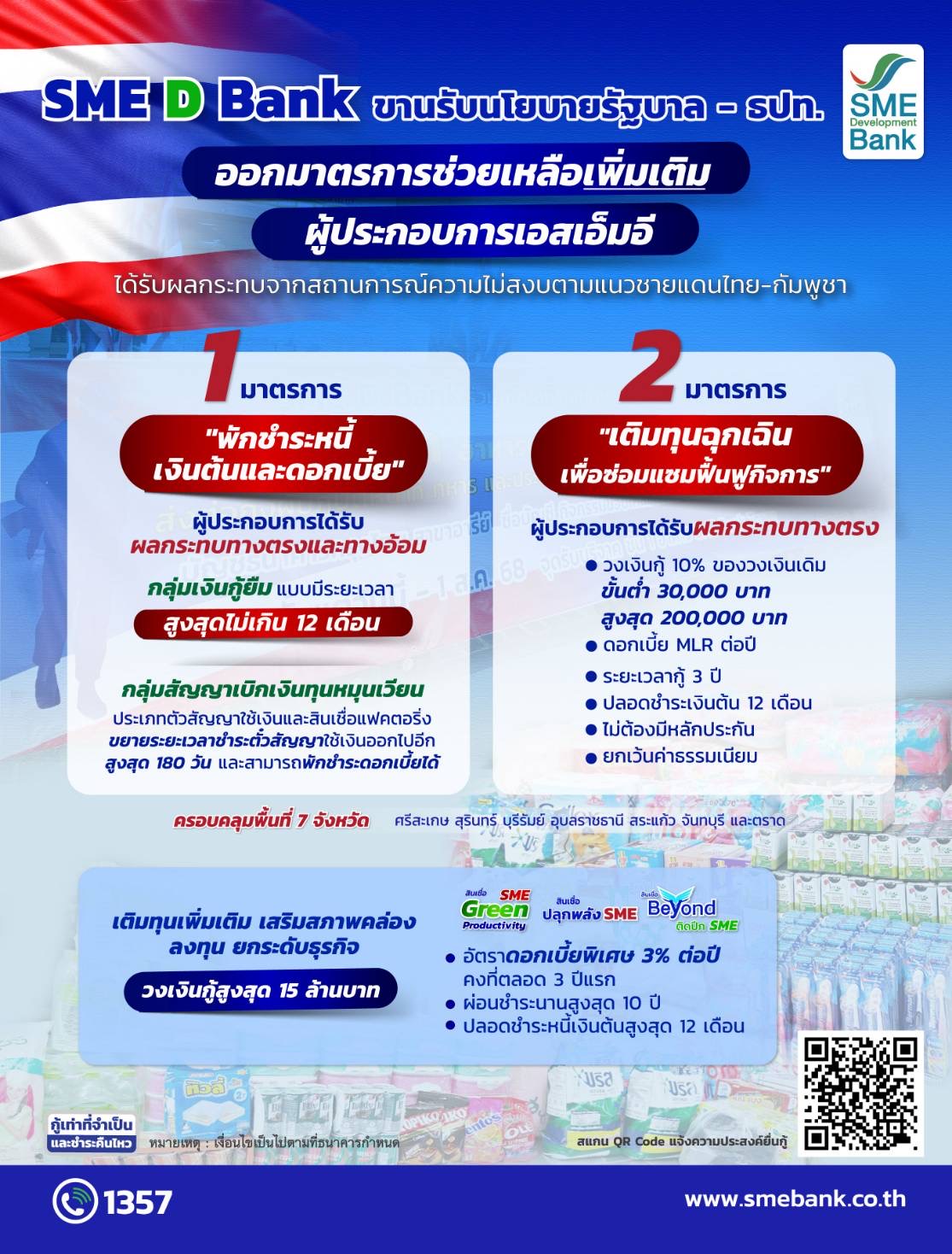 SME D Bank ห่วงใยประชาชน และเอสเอ็มอีได้รับผลกระทบจากเหตุความไม่สงบตามแนวชายแดนไทย-กัมพูชา ออกมาตรการช่วยเหลือเพิ่มเติม สอดคล้องนโยบายรัฐบาล โดยกระทรวงการคลัง และ ธปท. ได้แก่ พักชำระหนี้เงินต้นและดอกเบี้ย สูงสุด 12 เดือน ควบคู่เติมทุนฉุกเฉิน เพื่อซ่อมแซมฟื้นฟูกิจการ ครอบคลุมพื้นที่ 7 จังหวัด ประกอบด้วย ศรีสะเกษ สุรินทร์ บุรีรัมย์ อุบลราชธานี สระแก้ว จันทบุรี และตราด นอกจากนั้น เปิดสายด่วน 1357 รับแจ้งขอความช่วยเหลือทันท่วงที พร้อมเปิดรับบริจาคสิ่งของนำไปมอบให้แก่ผู้ประสบภัยและทหารหาญ