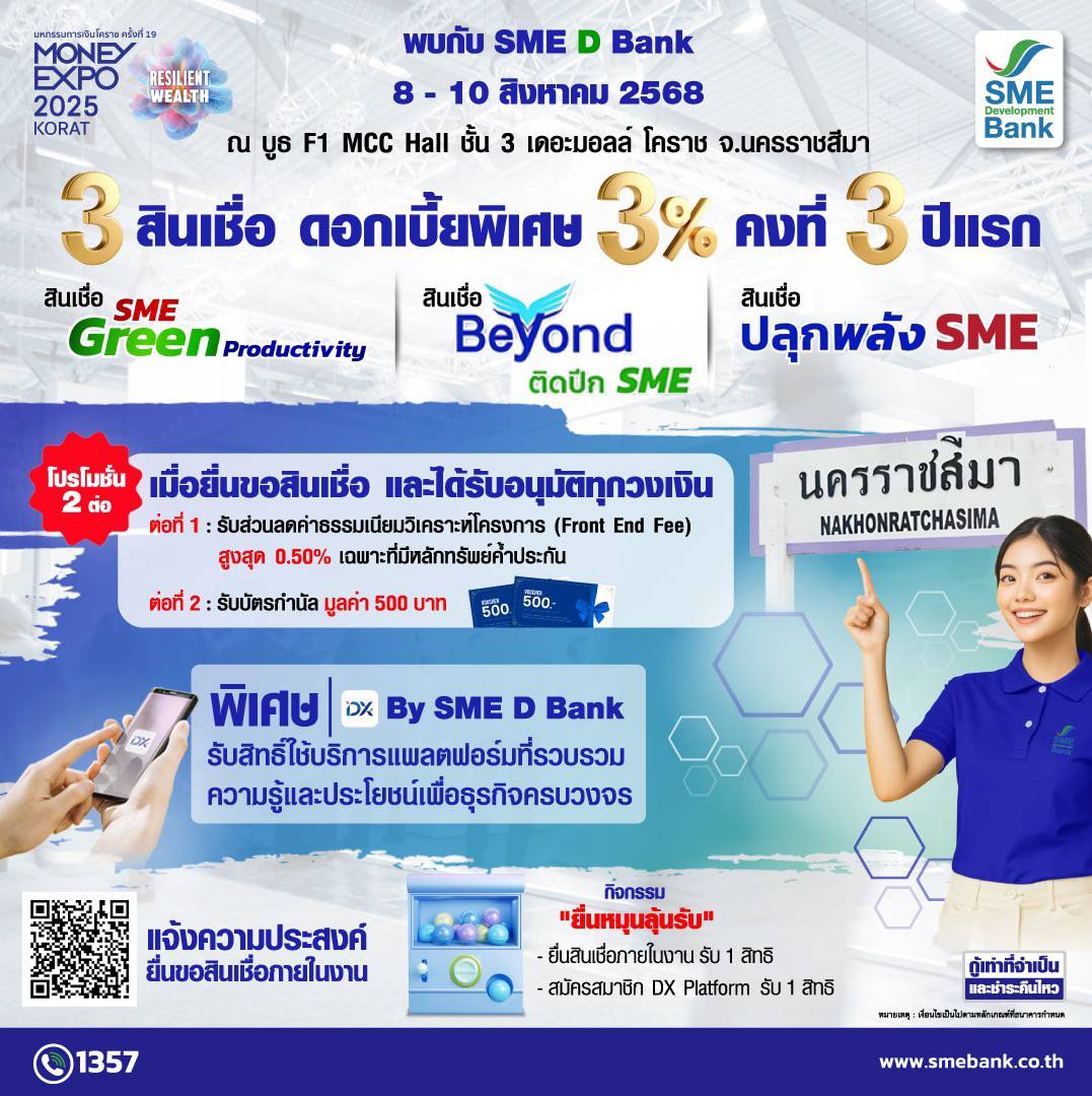 ธนาคารพัฒนาวิสาหกิจขนาดกลางและขนาดย่อมแห่งประเทศไทย (ธพว.) หรือ SME D Bank ร่วมงานมหกรรมการเงินโคราช ครั้งที่ 19 “MONEY EXPO 2025 KORAT” ระหว่างวันที่ 8-10 สิงหาคม 2568 ณ เอ็มซีซี ฮอลล์ ชั้น 3 ห้างสรรพสินค้าเดอะมอลล์ โคราช จังหวัดนครราชสีมา หมายเลขบูธ F1 ยกทัพบริการ “พัฒนาคู่เติมทุน” พบกับผลิตภัณฑ์สินเชื่อครอบคลุมทุกกลุ่มธุรกิจ ตอบโจทย์ทุกความต้องการผู้ประกอบการเอสเอ็มอี สินเชื่ออัตราดอกเบี้ยพิเศษเพียง 3% ต่อปี คงที่ตลอด 3 ปีแรก ผ่อนชำระนานสูงสุด 10 ปี ปลอดชำระหนี้เงินต้นสูงสุด 12 เดือน วงเงินกู้สูงสุด 15 ล้านบาท ได้แก่ 1. สินเชื่อ ปลุกพลัง SME, 2. สินเชื่อ Beyond ติดปีก SME และ 3. สินเชื่อ SME Green Productivity ควบคู่บริการพัฒนาธุรกิจ ผ่านแพลตฟอร์ม “DX by SME D Bank” (dx.smebank.co.th) ช่วยเสริมศักยภาพกิจการ ครบถ้วนในจุดเดียว พิเศษสุด! เฉพาะภายในงาน เมื่อยื่นขอสินเชื่อ และได้รับอนุมัติทุกวงเงิน รับโปรโมชันเสริมอีก 2 ต่อ ได้แก่ ต่อที่ 1 : ลดค่าธรรมเนียมวิเคราะห์สินเชื่อสูงสุด 0.50% (เฉพาะที่มีหลักทรัพย์ค้ำประกัน) และต่อที่ 2 : รับบัตรกำนัล มูลค่า 500 บาท พร้อมเล่นเกมกิจกรรม “ยื่นหมุนลุ้นรับ” ลุ้นรับของที่ระลึกมากมาย สอบถามข้อมูลเพิ่มเติม Call Center 1357