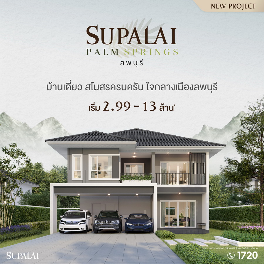 โอกาสดีที่คุณไม่ควรพลาด! บ้านเดี่ยวฟังก์ชันครบ บนทำเลศักยภาพ ใกล้เมือง รายล้อมด้วยสิ่งอำนวยความสะดวกมากมาย พร้อมให้คุณและครอบครัวใช้ชีวิตได้อย่างลงตัว ในราคาเริ่มต้นเพียง 2.99-13 ล้านบาท* ณ โครงการ “ศุภาลัย ปาล์มสปริงส์ ลพบุรี” (*เงื่อนไขเป็นไปตามที่บริษัทฯ กำหนด) สอบถามรายละเอียดเพิ่มเติม โทร. 1720 หรือ Facebook: Supalai