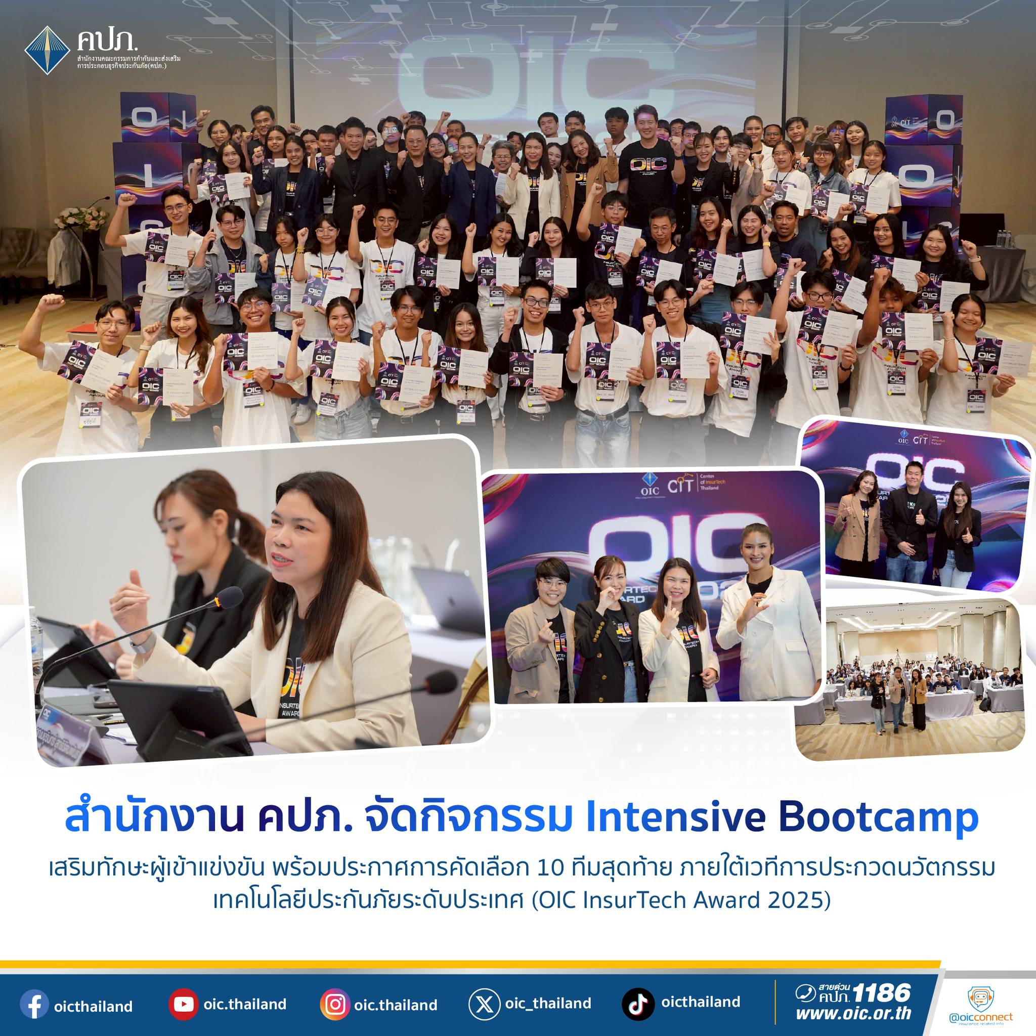 สำนักงานคณะกรรมการกำกับและส่งเสริมการประกอบธุรกิจประกันภัย (สำนักงาน คปภ.) ได้จัดกิจกรรม Intensive Bootcamp ภายใต้โครงการ “OIC InsurTech Award 2025” ระหว่างวันที่ 16 – 17 สิงหาคม 2568 เพื่อเสริมศักยภาพและยกระดับผลงานของผู้เข้าแข่งขัน ด้วยการถ่ายทอดองค์ความรู้และประสบการณ์จากผู้เชี่ยวชาญในหลากหลายด้าน เช่น การถ่ายทอดเทคนิคการสร้างต้นแบบ (Prototype) และกลยุทธ์การต่อยอดจากต้นแบบสู่ผลิตภัณฑ์และบริการที่พร้อมออกสู่ตลาด พร้อมแนะนำเทคนิคการนำเสนอ (Pitching) อย่างมืออาชีพ เพื่อสร้างความประทับใจแก่คณะกรรมการในรอบชิงชนะเลิศ