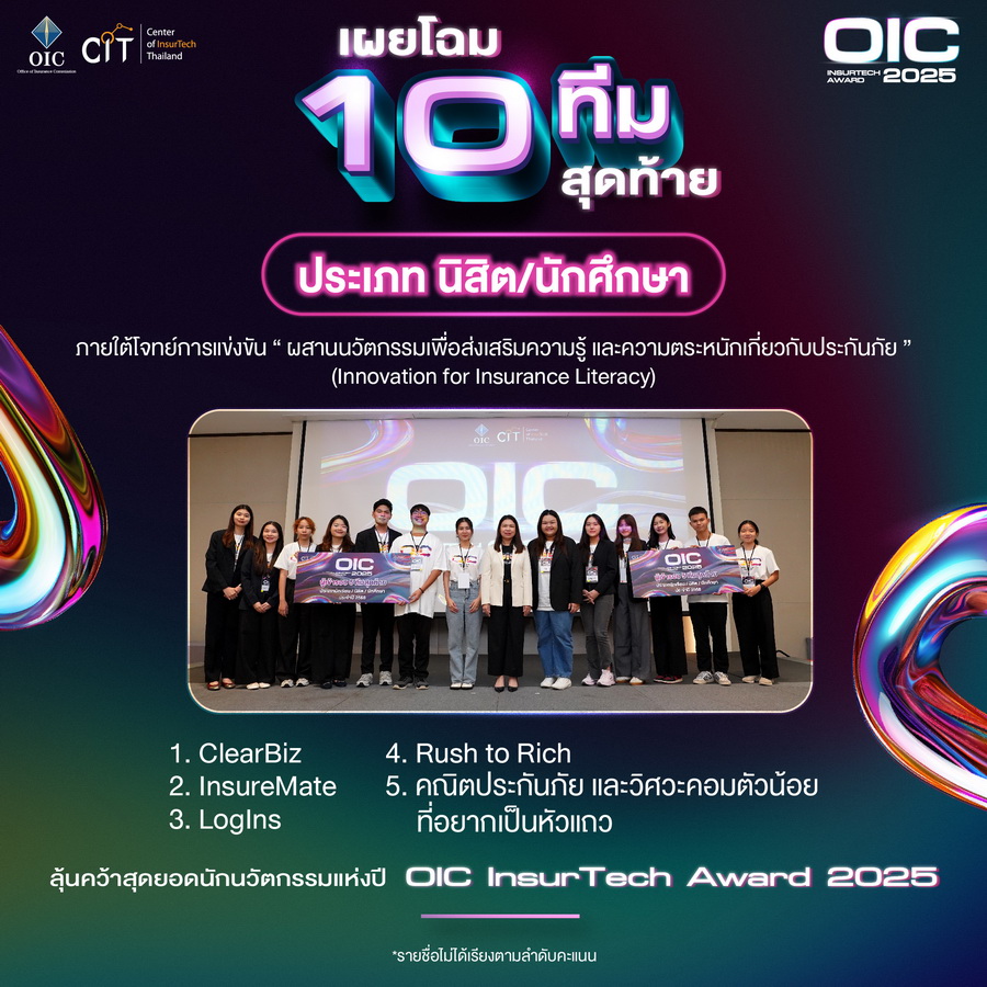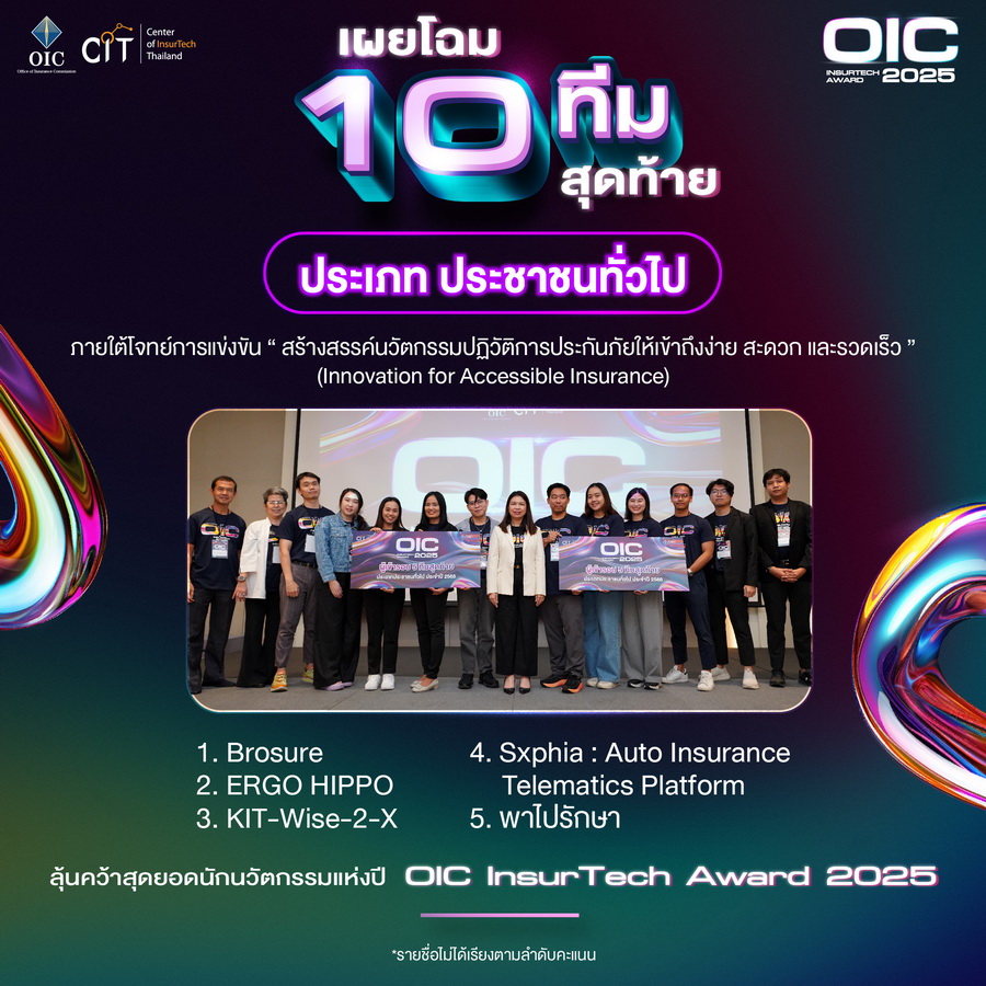 ในโอกาสนี้ สำนักงาน คปภ. ได้คัดเลือกผู้เข้าแข่งขันทั้งหมดจากมากกว่า 400 ทีม ผ่านการคัดเลือกกันอย่างเข้มจากคณะกรรมการผู้ทรงคุณวุฒิ และมีการปรับไอเดียจากคำแนะนำของที่ปรึกษาเฉพาะด้านพร้อมทั้งการนำเสนองานจริงแบบมืออาชีพ จนได้ 10 ทีมสุดท้าย เพื่อเป็นตัวแทนการแข่งขันบนเวทีประดับประเทศ OIC InsurTech Award 2025 (Finalists) แบ่งเป็น 2 ประเภท ได้แก่ ประเภท นิสิต/นักศีกษา ภายใต้โจทย์การแข่งขัน “ผสานนวัตกรรมเพื่อส่งเสริมความรู้ และความตระหนักเกี่ยวกับประกันภัย” (Innovation for Insurance Literacy) และประเภท ประชาชนทั่วไป ภายใต้โจทย์การแข่งขัน “สร้างสรรค์นวัตกรรมปฏิวัติการประกันภัยให้เข้าถึงง่าย สะดวก และรวดเร็ว” (Innovation for Accessible Insurance)