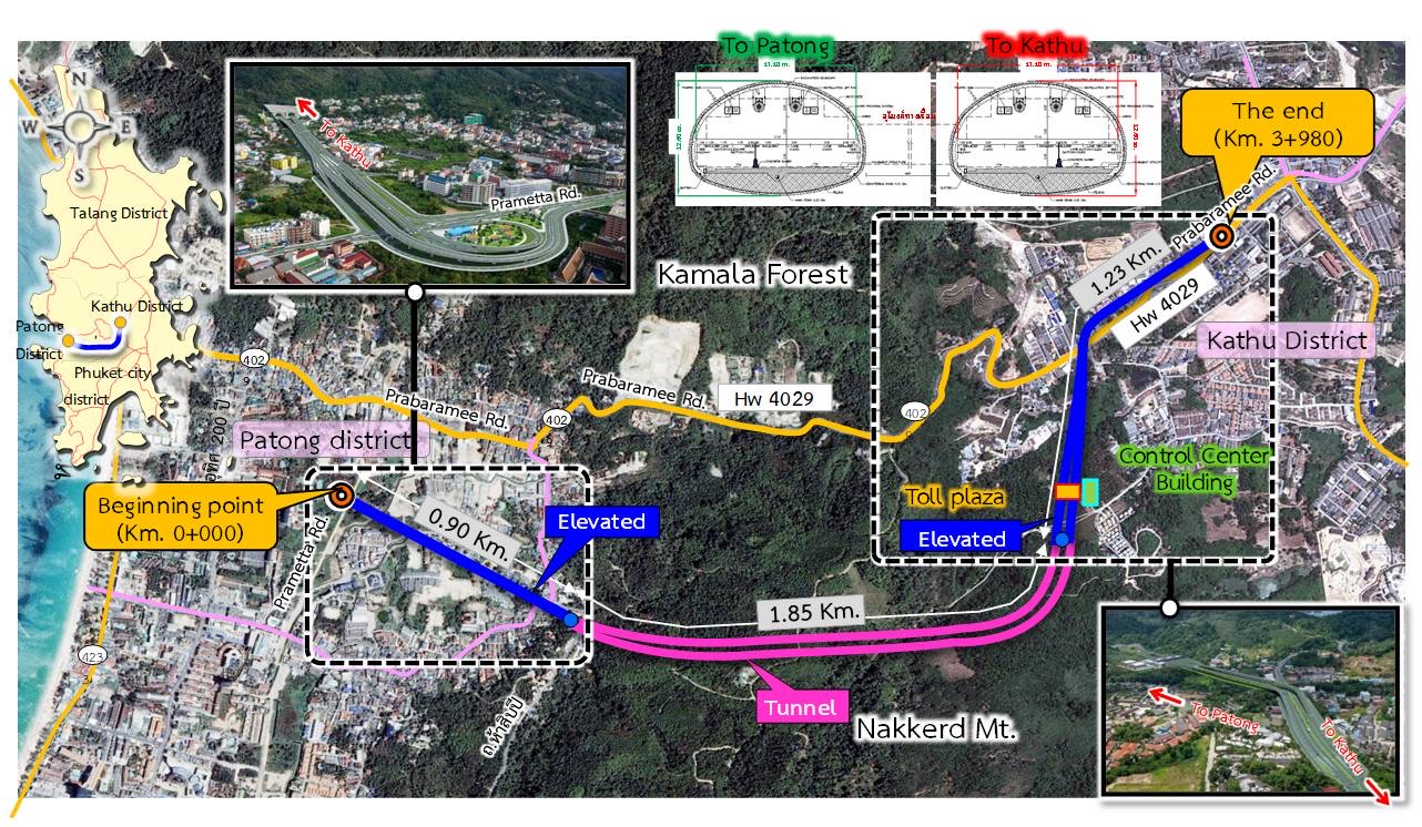 โครงการทางพิเศษจังหวัดภูเก็ต ระยะที่ 1 ช่วงกะทู้–ป่าตอง มีจุดเริ่มต้นโครงการเชื่อมกับถนนพระเมตตาในพื้นที่ตำบลป่าตอง อำเภอกะทู้ เป็นทางยกระดับขนาด 4 ช่องจราจรต่อทิศทาง (สำหรับรถยนต์ 2 ช่องจราจรต่อทิศทาง และรถจักรยานยนต์ 2 ช่องจราจรต่อทิศทาง) ยกระดับข้ามถนนพิศิษฐ์กรณีย์ จนถึงเขานาคเกิด ระยะทาง 0.90 กิโลเมตร แล้วจึงเป็นอุโมงค์ลอดเขานาคเกิด ระยะทาง 1.85 กิโลเมตร หลังจากผ่านช่วงภูเขาจึงเป็นทางยกระดับ ระยะทาง 1.23 กิโลเมตร จนถึงจุดสิ้นสุดโครงการในพื้นที่ตำบลกะทู้ อำเภอกะทู้ บริเวณจุดตัดกับทางหลวงแผ่นดินหมายเลข 4029 โครงการมีการจัดเก็บค่าผ่านทางแบบอัตราเดียว (Flat Rate) โดยในปีเปิดให้บริการ 2573 มีอัตราค่าผ่านทาง 15/40/85/125 บาท/คัน สำหรับรถจักรยานยนต์/รถ 4 ล้อ/รถ 6-10 ล้อ/รถมากกว่า 10 ล้อ ตามลำดับ จากนั้นจะมีการปรับค่าผ่านทางเพิ่มขึ้นทุก ๆ 5 ปี