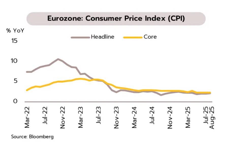 ECB ส่งสัญญาณใกล้ยุติวงจรดอกเบี้ยขาลง ขณะที่ปัญหาการเมืองในฝรั่งเศสมีโอกาสลากยาว ECB มีมติคงอัตราดอกเบี้ยที่ระดับ 2.0% ในการประชุมวันที่ 11 กันยายน โดยประธาน ECB ระบุว่าความเสี่ยงต่อเศรษฐกิจมีความสมดุลมากกว่าเดิม พร้อมปรับเพิ่มคาดการณ์ GDP ปี 2568 ขึ้นจาก 0.9% สู่ระดับ 1.2% ส่วนอัตราเงินเฟ้อปีนี้คาดไว้ที่ 2.1% ก่อนปรับลดลงต่ำกว่าเป้าหมายที่ 2% ในปี 2569-70