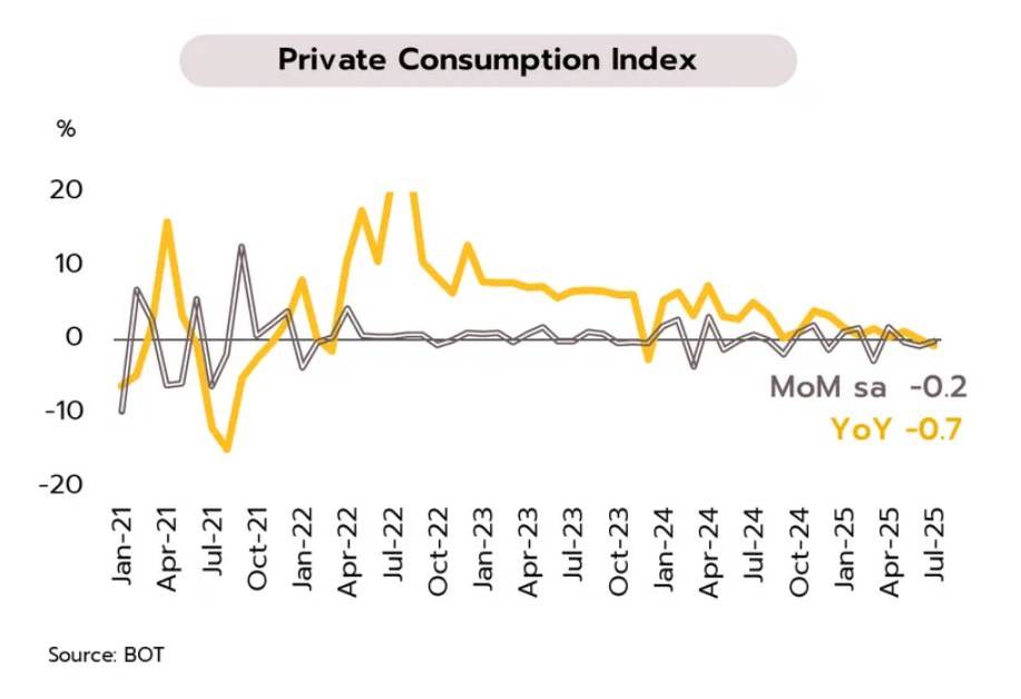 ความเชื่อมั่นผู้บริโภคที่ปรับลดลงต่อเนื่องจนแตะระดับต่ำสุดในรอบเกือบ 3 ปี เป็นสัญญาณสะท้อนถึงแรงกดดันต่อการใช้จ่ายภาคครัวเรือน สอดคล้องกับตัวเลขดัชนีการบริโภคภาคเอกชน (PCI) ซึ่งธปท. รายงานว่าในเดือนกรกฎาคมหดตัวติดต่อกันเป็นเดือนที่ 3 ที่ -0.2% MoM ท่ามกลางความไม่แน่นอนทางการเมือง ภาคท่องเที่ยวที่ฟื้นตัวช้า และการลดลงของรายได้เกษตรกรที่ได้รับผลกระทบจากราคาสินค้าเกษตรตกต่ำ อย่างไรก็ตาม ล่าสุดรัฐบาลชุดใหม่เตรียมนำมาตรการกระตุ้นการใช้จ่าย เช่น โครงการ “คนละครึ่ง” กลับมาใช้อีกครั้ง โดยอาจใช้งบประมาณวงเงินราว 2.5 หมื่นล้านบาท ซึ่งเดิมเตรียมไว้ใช้ทำโครงการ Digital Wallet ช่วยพยุงการบริโภคภายในประเทศในระยะสั้น รวมทั้งช่วยบรรเทาความกังวลของผู้บริโภค ผู้ประกอบการ SME และธุรกิจรายย่อยที่พึ่งพาการบริโภคภายในประเทศเป็นหลัก โดยภาพรวมน่าจะทำให้เศรษฐกิจไทยยังพอมีแรงขับเคลื่อนจากอุปสงค์ในประเทศในช่วงไตรมาสสุดท้ายของปีนี้ ซึ่งเป็นจังหวะที่แรงกดดันจากภาคต่างประเทศส่งผลต่อการส่งออกชัดเจนขึ้น