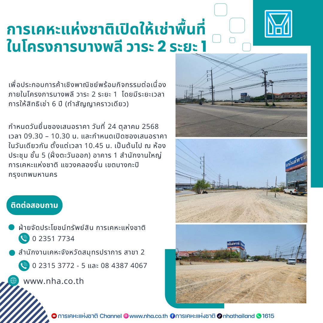 นายอรรคพล ภิรมย์ประดิษฐ์ ผู้อำนวยการฝ่ายจัดประโยชน์ทรัพย์สิน กล่าวว่า การเคหะแห่งชาติ เปิดให้เอกชนยื่นซองเสนอราคาค่าธรรมเนียมการได้สิทธิเช่าที่ดินแปลงว่าง เพื่อประกอบการค้าเชิงพาณิชย์พร้อมกิจกรรมต่อเนื่อง ภายในโครงการบางพลี วาระ 2 ระยะ 1 ตั้งอยู่ที่ติดถนนทางหลวงชนบท สป.1006 อำเภอบางเสาธง จังหวัดสมุทรปราการ บางส่วนของโฉนดที่ดินเลขที่ 16077 ขนาดเนื้อที่ประมาณ 3-3-33 ไร่ (1,533 ตารางวา) เพื่อให้เกิดความโปร่งใสในการดำเนินงานทุกขั้นตอนตามหลักธรรมาภิบาล การเคหะแห่งชาติจึงเปิดโอกาสให้เอกชนที่สนใจสามารถยื่นข้อเสนอราคาการได้สิทธิเช่าที่ดินดังกล่าว โดยมีอัตราค่าธรรมเนียมการได้สิทธิเช่าขั้นต่ำไม่น้อยกว่า 1,700,000 บาท (หนึ่งล้านเจ็ดแสนบาทถ้วน) ระยะเวลาการให้สิทธิเช่า 6 ปี (ทำสัญญาคราวเดียว) ปีที่ 1-3 ค่าเช่าเดือนละ 113,500 บาท ปีที่ 4-6 เดือนละ 123,800 บาท กำหนดหลักประกันการยื่นซองเสนอราคาจำนวน 100,000 บาท กำหนดเงินประกันการปฏิบัติตามสัญญา เป็นเงิน 371,400 บาท โดยกำหนดวันยื่นซองเสนอราคาฯ ในวันที่ 24 ตุลาคม 2568 เวลา 09.30-10.30 น. และกำหนดเปิดซองเสนอราคาในวันเดียวกัน ตั้งแต่เวลา 10.45 น. เป็นต้นไป ณ ห้องประชุม ชั้น 5 (ฝั่งตะวันออก) อาคาร 1 สำนักงานใหญ่ การเคหะแห่งชาติ แขวงคลองจั่น เขตบางกะปิ กรุงเทพมหานคร