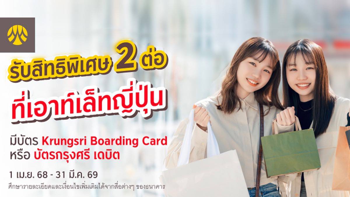 กรุงเทพฯ (26 กันยายน 2568) – กรุงศรี (ธนาคารกรุงศรีอยุธยา จำกัด (มหาชน)) ชวนลูกค้าบัตร Krungsri Boarding Card และบัตรกรุงศรี เดบิต ช้อปสุดคุ้มที่เอาท์เล็ทกว่า 20 สาขาทั่วญี่ปุ่น เพียงแสดง QR code พร้อมบัตรที่เคาน์เตอร์ประชาสัมพันธ์ เพื่อรับสมุดคูปองส่วนลดและ Shopping Voucher และใช้จ่ายผ่านบัตร Krungsri Boarding Card หรือบัตรกรุงศรี เดบิต ณ ร้านค้าที่ร่วมรายการภายในเอาท์เล็ท ตั้งแต่ 1 เมษายน 2568 – 31 มีนาคม 2569 รับสิทธิพิเศษ 2 ต่อดังนี้