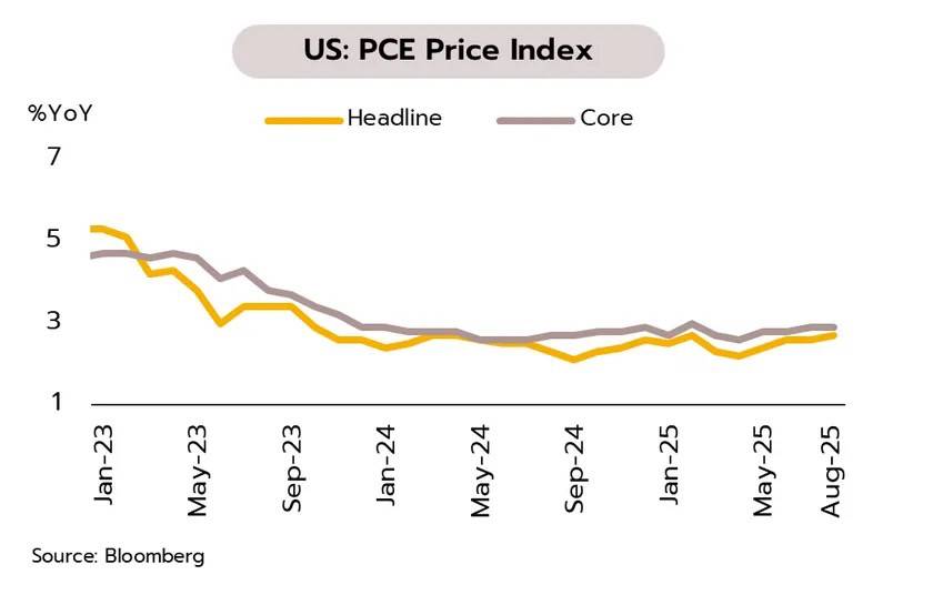 สหรัฐฯ เผชิญความไม่แน่นอนสูงขึ้นทั้งด้านเศรษฐกิจ เงินเฟ้อ และดอกเบี้ย หลังทรัมป์ยกระดับสงครามการค้า เศรษฐกิจสหรัฐฯ ไตรมาส 2 ขยายตัว 3.8% QoQ annualized สูงกว่าคาดการณ์ที่ 3.3% ขณะที่จำนวนผู้ขอรับสวัสดิการว่างงานครั้งแรกในสัปดาห์สิ้นสุดวันที่ 20 กันยายน 2568 ปรับลดลงสู่ 2.18 แสนราย ต่ำสุดตั้งแต่เดือนกรกฎาคม อย่างไรก็ตาม ดัชนีความเชื่อมั่นผู้บริโภคเดือนกันยายนร่วงลงสู่ 55.1 จากเดือนก่อนที่ 58.2 ขณะที่เงินเฟ้อที่วัดจากดัชนีราคา PCE เดือนสิงหาคมเร่งขึ้นสู่ 2.7% YoY ซึ่งสูงสุดในรอบ 6 เดือน