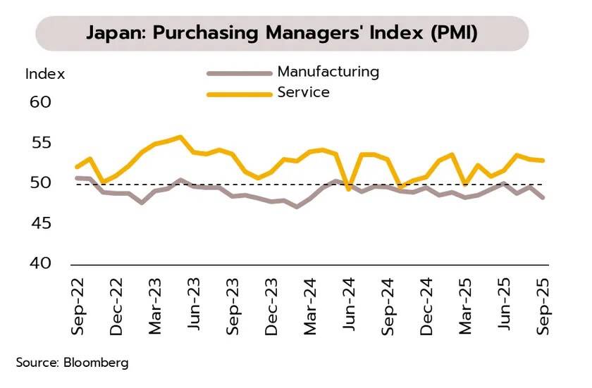 การเลือกตั้งผู้นำ LDP คนใหม่ หนุนความเชื่อมั่นแผนกระตุ้นเศรษฐกิจ ในเดือนกันยายน ดัชนี PMI ภาคการผลิตเบื้องต้นลดลงสู่ระดับ 48.4 จาก 49.7 ในเดือนก่อน ซึ่งหดตัวแรงที่สุดในรอบ 6 เดือน ขณะที่ PMI ภาคบริการเบื้องต้นชะลอลงเล็กน้อยจาก 53.1 สู่ 53.0 ส่วนอัตราเงินเฟ้อกรุงโตเกียว (Tokyo CPI) ทรงตัวที่ 2.5% YoY