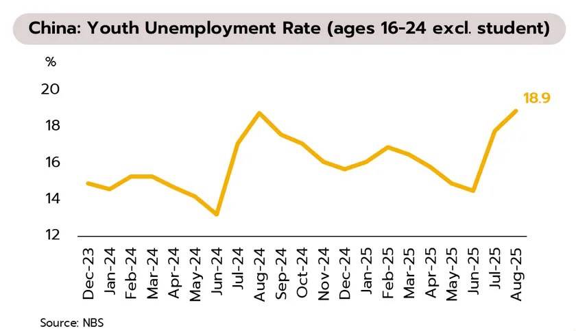 ภาวะอุปทานส่วนเกินและตลาดแรงงานที่เปราะบางยังคงกดดันเศรษฐกิจจีน กำไรภาคอุตสาหกรรมในช่วง 8 เดือนแรกของปีนี้ขยายตัวเพียง 0.9% YoY จาก -1.7% ในช่วง 7 เดือนแรก ส่วนอัตราการว่างงานในกลุ่มคนหนุ่มสาว (อายุ 16-24 ปีไม่รวมนักเรียน) เพิ่มขึ้นสู่ระดับ 18.9% ในเดือนสิงหาคมจาก 17.8% ในเดือนกรกฎาคม ขณะที่ดัชนี PMI ย่อยด้านการจ้างงานในภาคการผลิตและนอกการผลิตในเดือนสิงหาคมยังคงอยู่ในโซนการหดตัวติดต่อกันเป็นเดือนที่ 30 ที่ 47.9 และ 45.6 ตามลำดับ