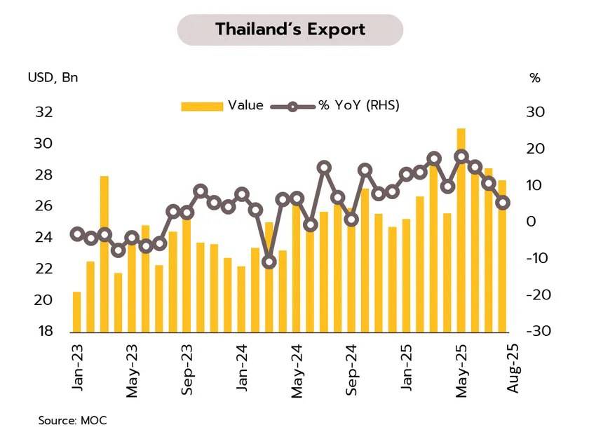 มูลค่าส่งออกเดือนสิงหาคมเติบโตชะลอเหลือเลขหลักเดียวในรูปเงินดอลลาร์ และหดตัวต่อเนื่องเป็นเดือนที่ 2 ในรูปเงินบาท กระทรวงพาณิชย์รายงานมูลค่าส่งออกในเดือนสิงหาคมอยู่ที่ 27.7 พันล้านดอลลาร์ ขยายตัวต่ำสุดในรอบ 11 เดือนที่ 5.8% YoY หากหักสินค้าที่เกี่ยวเนื่องกับน้ำมัน และทองคำ การส่งออกเติบโต 5.4% โดยการส่งออกสินค้าสำคัญที่ยังขยายตัว อาทิ เครื่องคอมพิวเตอร์และอุปกรณ์ แผงวงจรไฟฟ้า และผลิตภัณฑ์ยาง ขณะที่การส่งออกสินค้าเกษตรกลับมาหดตัวโดยได้รับแรงกดดันจากการแข่งขันทางด้านราคา อาทิ ข้าว ยางพารา และมันสำปะหลัง ด้านตลาดส่งออกพบว่าตลาดหลักที่ขยายตัว เช่น สหรัฐฯ จีน และอาเซียน ขณะที่หดตัวในตลาดสหภาพยุโรป และญี่ปุ่น สำหรับในช่วง 8 เดือนแรกของปี 2568 มูลค่าการส่งออกอยู่ที่ 223.2 พันล้านดอลลาร์ ขยายตัว 13.3%