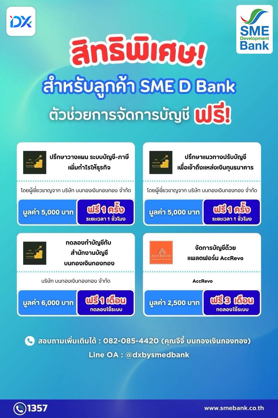 ธนาคารพัฒนาวิสาหกิจขนาดกลางและขนาดย่อมแห่งประเทศไทย (ธพว.) หรือ SME D Bank เดินหน้าเติมเต็มความรู้ด้านการเงิน (Financial Literacy) โดยเฉพาะด้านวางแผนภาษี และการจัดทำบัญชี ให้แก่ผู้ประกอบการเอสเอ็มอี ซึ่งมีความสำคัญอย่างยิ่ง ช่วยสร้างประโยชน์เข้าสู่ระบบภาษีอย่างถูกต้องตามนโยบายรัฐบาล รวมถึง สร้างความน่าเชื่อถือและลดต้นทุนให้ธุรกิจ อีกทั้ง เปิดโอกาสเข้าถึงแหล่งเงินทุนจากสถาบันการเงิน ด้วยการมอบสิทธิประโยชน์มากมาย เพียงสมัครเป็นสมาชิกแพลตฟอร์ม “DX by SME D Bank” (dx.smebank.co.th) บริการพัฒนาธุรกิจครบวงจร ใช้งานง่าย สะดวกทุกที ทุกเวลา ตลอด 24 ชั่วโมง โดยมีสิทธิ์ประโยชน์ต่าง ๆ มากมาย เช่น เข้าพบที่ปรึกษาวางแผนภาษีธุรกิจแบบส่วนตัว จากผู้เชี่ยวชาญ บริษัท บนกองเงินกองทอง จำกัด รูปแบบออนไลน์ ฟรี 1 ครั้ง (มูลค่า 5,000 บาท) หรือแลกสิทธิ์ใช้งานระบบบัญชีออนไลน์ Accrevo ฟรี 3 เดือน (มูลค่า 2,500 บาท) เป็นต้น รวมถึง E-Learning รวบรวมหลักสูตรความรู้ด้านการเงินอีกมากมาย