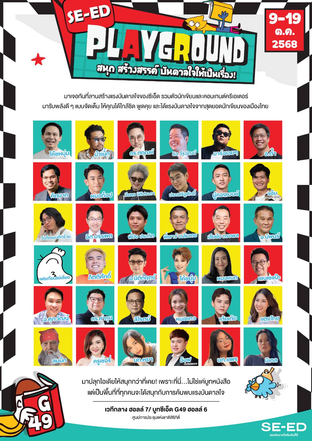 “SE-ED PLAYGROUND” คือ “สนามเล่นของไอเดีย” ที่เปิดโอกาสให้ทุกคนได้ปลดล็อกความคิด ปลดปล่อยความสนุก และค้นหาแรงบันดาลใจใหม่ ๆ ผ่านกิจกรรมที่หลากหลาย ตั้งแต่พบปะนักเขียนชื่อดัง เสวนาวรรณกรรม ไปจนถึงเวิร์กช็อปสร้างสรรค์ที่ต่อยอดได้จริง