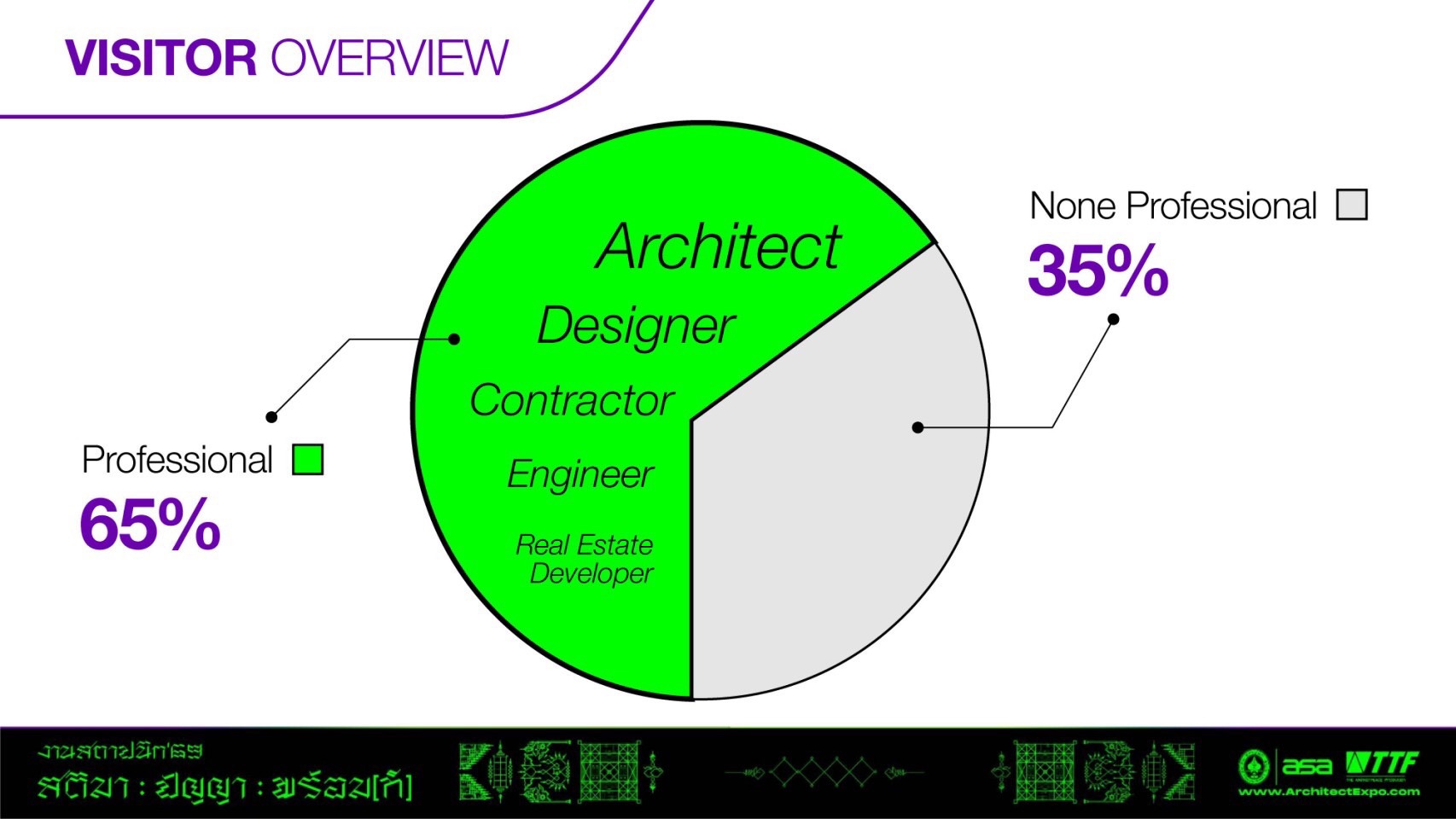 “สำหรับข้อมูลผู้เข้าชมงานสถาปนิก’68 กว่า 3.25 แสนคน คิดเป็นสัดส่วนผู้เชี่ยวชาญในแวดวงอุตสาหกรรมออกแบบและก่อสร้างกว่า 65% โดยกลุ่มอาชีพที่เข้าชมงานมากที่สุดคือ สถาปนิก คิดเป็น 14.19% รองลงมาคือ ดีไซเนอร์ 8.94% ผู้รับเหมา 8.13% วิศวกร 7.60% ตัวแทนจำหน่ายหรือผู้ค้าส่งวัสดุก่อสร้าง 6.68% และนักลงทุนหรือผู้พัฒนาอสังหาริมทรัพย์ 4.04% ขณะที่หากจำแนกตามระดับตำแหน่งงาน พบว่า เจ้าของธุรกิจและผู้มีส่วนได้ส่วนเสียต่อธุรกิจจะครองสัดส่วนสูงสุดถึง 22.61% ตามด้วยระดับหัวหน้างาน 7.24% ระดับผู้บริหารระดับกลาง 5.45% และผู้บริหารระดับสูง 4.46% ทั้งหมดนี้สะท้อนให้เห็นว่างานสถาปนิกเป็นจุดเชื่อมโยงเครือข่ายผู้มีอำนาจตัดสินใจในภาคอุตสาหกรรม ตั้งแต่ระดับนักออกแบบมืออาชีพไปจนถึงนักลงทุนรายใหญ่”