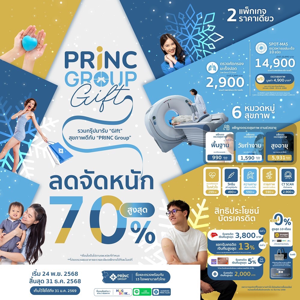 PRINC Group ผนึกกำลังโรงพยาบาลในเครือ 16 แห่งทั่วประเทศ เปิดตัวแคมเปญสุขภาพส่งท้ายปี “PRINC GROUP GIFT มหกรรมสุขภาพ ลดใหญ่ส่งท้ายปี” ชวนประชาชน “รวมกรุ๊ปมารับ Gift สุขภาพดี กับ PRINC Group” มอบสุขภาพดีให้ตัวเองและคนที่รัก ด้วยแพ็กเกจตรวจสุขภาพและบริการทางการแพทย์ในราคาที่เข้าถึงได้ พร้อมส่วนลดสูงสุดกว่า 70% ตั้งแต่วันนี้ – 31 ธันวาคม 2568