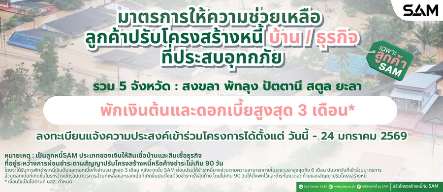 SAM ออกมาตรการพักชำระเงินต้น-ลดดอกเบี้ยสูงสุด 3 เดือนช่วยเหลือลูกค้าผู้ประสบภัยน้ำท่วมใน 5 จังหวัดทางภาคใต้ เพื่อบรรเทาความเดือดร้อน
