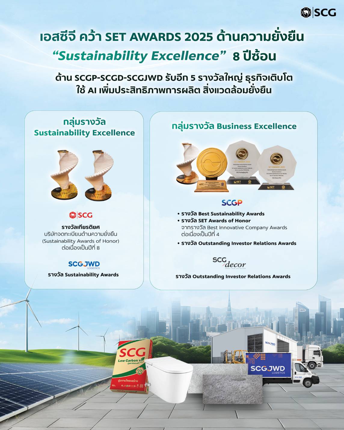 เอสซีจี คว้า SET AWARDS 2025 ด้านความยั่งยืน “Sustainability Excellence” 8 ปีซ้อนด้าน SCGP-SCGD-SCGJWD รับอีก 5 รางวัลใหญ่ ธุรกิจเติบโตใช้ AI เพิ่มประสิทธิภาพการผลิต สิ่งแวดล้อมยั่งยืน