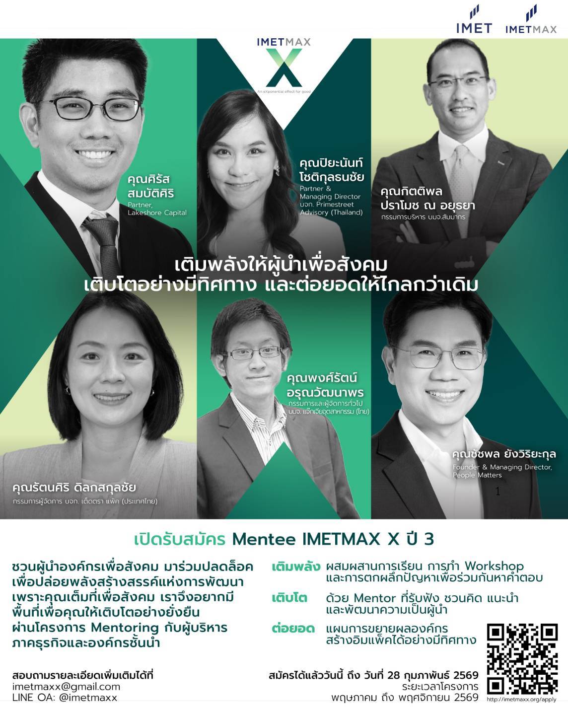ในปี 2569 นี้ มูลนิธิเพื่อสถาบันการศึกษาวิชาการจัดการแห่งประเทศไทย (IMET) พร้อมต่อยอดความสำเร็จเปิดรับสมัคร “ผู้นำทางสังคม” (Social Changemakers) องค์กรนิติบุคคล ประเภทบริษัทจำกัด หรือ มูลนิธิ ร่วมเรียนรู้ผ่านกระบวนการ Mentoring กับ 18 ผู้บริหารระดับสูงจากองค์กรชั้นนำของประเทศ ในโครงการ IMET MAX X ปี 3 ตั้งแต่วันนี้ ถึงวันที่ 28 กุมภาพันธ์ 2569 ที่ imetmaxx.org/apply สอบถามรายละเอียดเพิมเติมได้ที่ LINE OA: @imetmaxx หรือที่ imetmaxx@gmail.com