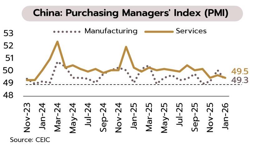 จีน: หวังพึ่งส่งออกหลังสัญญาณชีพทางเศรษฐกิจอ่อนแอ โดย PMI ภาคการผลิตพลิกกลับมาหดตัวอีกครั้งในเดือนมกราคม ส่วนภาคบริการหดตัวติดต่อกันเป็นเดือนที่ 3 (ดังรูป) อีกด้านหนึ่ง จีนได้ทยอยบรรลุข้อตกลงทางการค้ากับชาติต่าง ๆ เช่น แคนาดา สหภาพยุโรป และสหราชอาณาจักร ซึ่งคาดว่าจะช่วยบรรเทาความเสี่ยงในยามที่เศรษฐกิจจีนต้องพึ่งพาการส่งออกต่อไป อย่างไรก็ตาม ยังต้องระวังความตึงเครียดทางการค้าจากนโยบายภาษีนำเข้าของสหรัฐฯ และความเข้มงวดในการใช้มาตรการควบคุมการส่งออกสินค้าเชิงยุทธศาสตร์ของจีนเอง