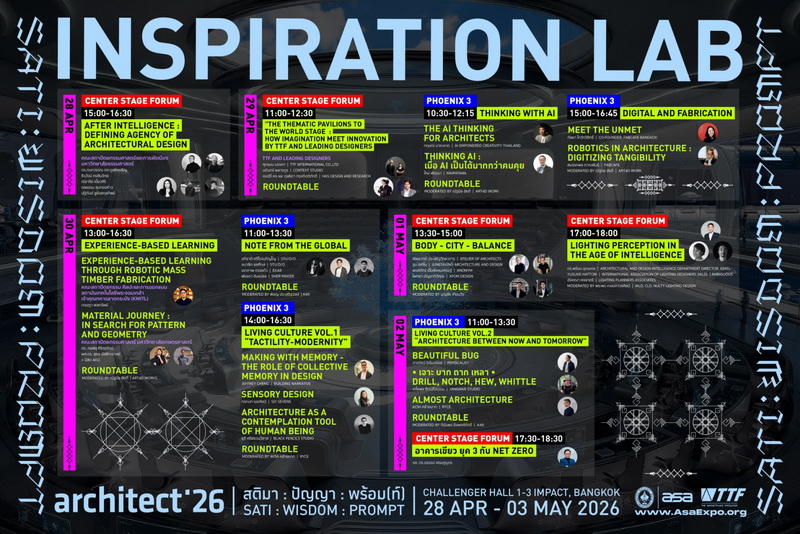 ทั้งนี้ กิจกรรมเสวนา ASA INTERNATIONAL FORUM จัดขึ้นเพียง 2 วัน (ช่วงงานสถาปนิก’69) ในวันที่ 2 และ 3 พฤษภาคม 2569 ณ ห้องฟินิกซ์ 4-6 อาคารอิมแพ็ค เอ็กซิบิชั่น เซ็นเตอร์ ส่วนกิจกรรม ASA INSPIRATION LAB จัดขึ้นตั้งแต่วันที่ 28 เมษายน – 3 พฤษภาคม ณ บริเวณเวทีกลางภายในอาคาร อิมแพ็ค ชาเลนเจอร์ 1-3 และห้องฟินิกซ์ 1-3 อาคารอิมแพ็ค เอ็กซิบิชั่น สำหรับผู้ที่สนใจสามารถติดตามรายละเอียดเพิ่มเติมและลงทะเบียนร่วมงานล่วงหน้า โดยไม่มีค่าใช้จ่ายผ่านทาง www.asaexpo.org