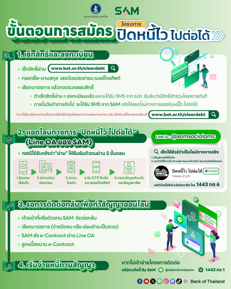 ทั้งนี้  ลูกหนี้สามารถตรวจสอบสิทธิ์เข้าร่วมโครงการได้ด้วยตนเอง แบบ “คลิกเดียวรู้ผลทันที” ผ่านช่องทางหลัก เว็บไซต์ ธนาคารแห่งประเทศไทย (ธปท.) www.bot.or.th/cleardebt  และเว็บไซต์ บริษัท บริหารสินทรัพย์สุขุมวิท จำกัด www.sam.or.th  เพียงกรอกข้อมูลส่วนตัว อาทิ ชื่อ-นามสกุล หมายเลขบัตรประชาชน หมายเลขโทรศัพท์ให้ครบถ้วน และหากลูกหนี้มีคุณสมบัติครบถ้วนตามเงื่อนไขทีกำหนด ระบบจะลงทะเบียนการเข้าร่วมโครงการให้โดยอัตโนมัติทันที!  จากนั้นลูกหนี้จะได้รับการติดต่อผ่านทาง SMS จากธนาคารแห่งประเทศไทย และ SAM เพื่อยืนยันว่ามีคุณสมบัติตรงตามเงื่อนไขและสามารถเข้าร่วมโครงการได้  พร้อมระบุให้ลูกหนี้แอดไลน์ @samsocialamc และยืนยันตัวตน ซึ่งเป็นขั้นตอนสุดท้ายที่สำคัญ  สำหรับ 5 ขั้นตอนการยืนยันตัวตนผ่าน Line@socialamc มีดังนี้ 1.กดยินยอม เพื่อเข้าสู่ระบบและกดยินยอมรับเงื่อนไขโครงการ  2. สแกนบัตรประชาชนและสแกนใบหน้า  โดยถ่ายรูปบัตรประชาชนเพื่อยืนยันตัวตน 3. รับรหัส OTP เพื่อยืนยันหมายเลขโทรศัพท์  และ 4.กรอกข้อมูลส่วนตัว: ทำการตรวจสอบและยืนยันข้อมูลให้ถูกต้อง จากนั้นรอการติดต่อกลับจากเจ้าหน้าที่เพื่อเข้าสู่กระบวนการปรับโครงสร้างหนี้  เลือกมาตรการปรับโครงสร้างหนี้ไปจนถึงการทำสัญญาและชำระเงินผ่านระบบออนไลน์ให้สำเร็จสมบูรณ์ต่อไป