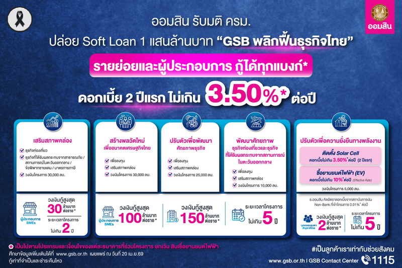 โครงการสินเชื่อดอกเบี้ยต่ำ (Soft Loan) “GSB พลิกฟื้นธุรกิจไทย” วงเงินโครงการรวม 100,000 ล้านบาท ธนาคารออมสินให้วงเงินสินเชื่อดอกเบี้ยต่ำมากแก่สถาบันการเงินและผู้ให้บริการทางการเงินอื่น ๆ ที่ไม่ใช่สถาบันการเงิน (Non – Bank) ที่เข้าร่วมโครงการ เพื่อให้ทุกรายนำวงเงินสินเชื่อนั้นไปปล่อยกู้ต่อให้กับลูกค้ารายย่อย ผู้ประกอบการ SMEs และธุรกิจขนาดใหญ่ ในอัตราดอกเบี้ย 2 ปีแรก ไม่เกิน 3.50% ต่อปี โดยเป็นไปตามโปรแกรมและเงื่อนไขที่แต่ละธนาคารกำหนด (*ยกเว้นการกู้ซื้อรถ EV) ใน 3 วัตถุประสงค์หลัก คือ 1) สินเชื่อเพื่อเสริมสภาพคล่อง 2) สินเชื่อเพื่อขยายธุรกิจ สำหรับผู้ประกอบการ SMEs และธุรกิจขนาดใหญ่ ในอุตสาหกรรมที่มีความสำคัญทางยุทธศาสตร์ และ 3) สินเชื่อกรณีปรับตัวเพื่อความยั่งยืนทางพลังงานสำหรับประชาชน โดยมีรายละเอียดสินเชื่อในกรณีต่าง ๆ ของโครงการฯ ดังนี้