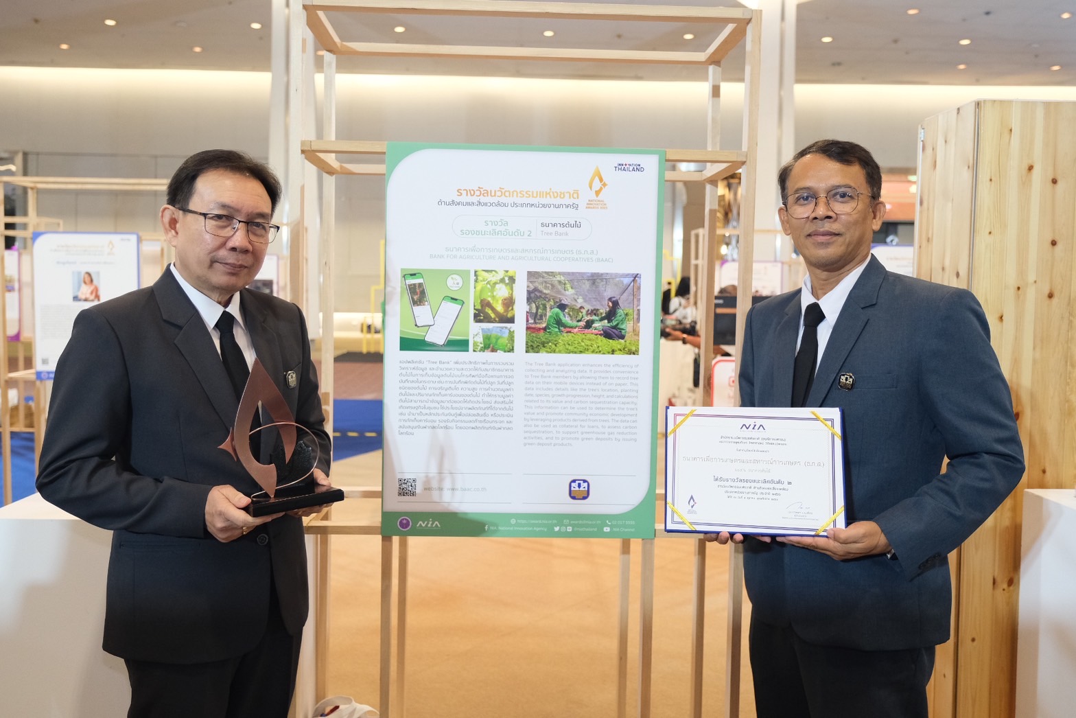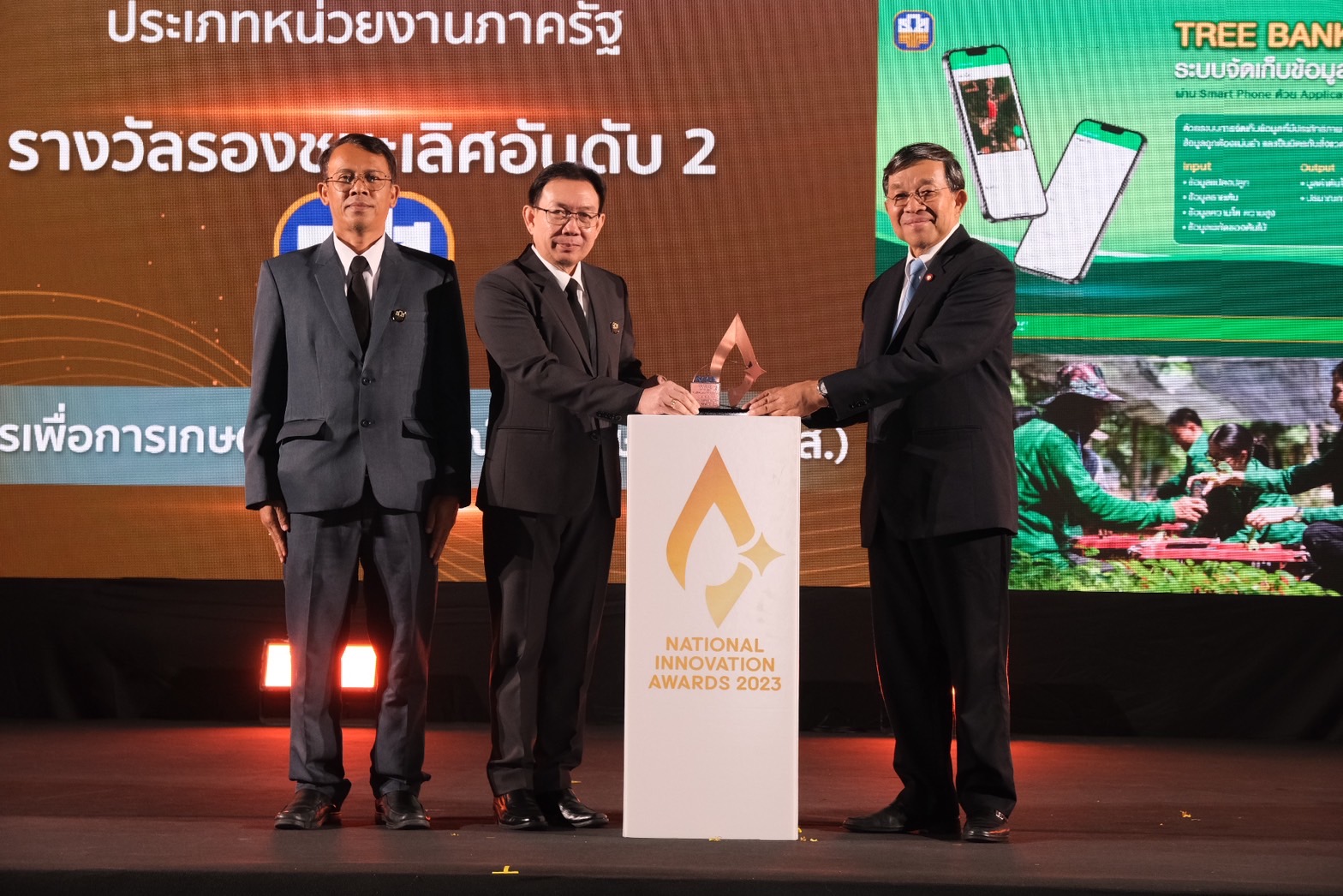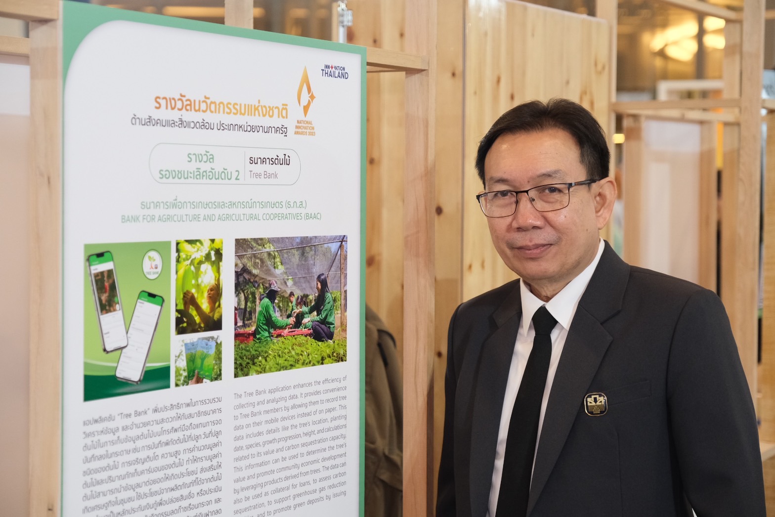 วันนี้ (5 ตุลาคม 2566) ณ รอยัล พารากอน ฮอลล์ ชั้น 5 สยามพารากอน กรุงเทพฯ นายเกียรติศักดิ์ พระวร ผู้ช่วยผู้จัดการธนาคารเพื่อการเกษตรและสหกรณ์การเกษตร (ธ.ก.ส.) ร่วมพิธีรับรางวัลนวัตกรรมแห่งชาติ ประจำปี 2566 (National Innovation Awards 2023) จัดขึ้นโดยสำนักงานนวัตกรรมแห่งชาติ (องค์การมหาชน) ซึ่งเป็นรางวัลนวัตกรรม อันทรงเกียรติสูงสุดของประเทศไทยที่มอบให้กับองค์กรที่มีการบริหารจัดการโดยใช้ความรู้ เทคโนโลยี และความคิดสร้างสรรค์ มาประยุกต์ใช้เพื่อให้เกิดคุณค่าทั้งในเชิงธุรกิจและเพื่อการเติบโตอย่างยั่งยืน โดย ธ.ก.ส. ได้รับรางวัลรองชนะเลิศ อันดับ 2 ในด้านสังคมและสิ่งแวดล้อม ประเภทวิสาหกิจขนาดย่อมและวิสาหกิจรายย่อยจากโครงการธนาคารต้นไม้ ที่มีจุดประสงค์เพื่อการสร้างความยั่งยืนด้านสิ่งแวดล้อมภายใต้หลักการพัฒนาที่ยั่งยืน (Sustainable Development Goals : SDGs) ตามแนวทางปรัชญาของเศรษฐกิจพอเพียง และการพัฒนาเศรษฐกิจแบบองค์รวม (BCG Model) พร้อมยกระดับชุมชนธนาคารต้นไม้และชุมชนไม้มีค่ากว่า 6,800 ชุมชน ไปสู่การขับเคลื่อนภารกิจซื้อ – ขายคาร์บอนเครดิตภาคป่าไม้ผ่านโครงการ BAAC Carbon Credit เพื่อยกระดับคุณภาพชีวิตเกษตรกรและพัฒนา ภาคเกษตรไทยอย่างยั่งยืน