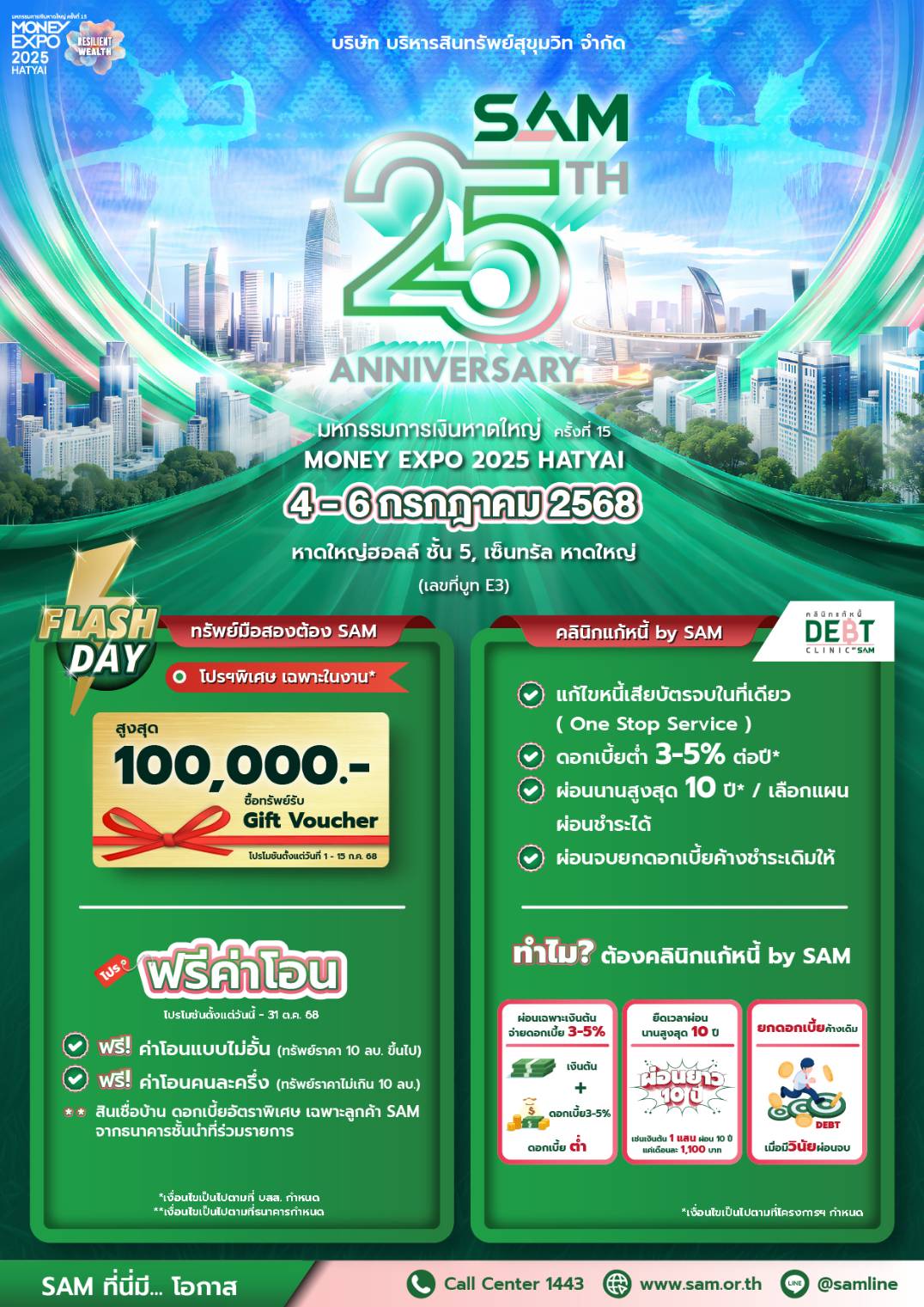 บริษัท บริหารสินทรัพย์สุขุมวิท จำกัด (บสส.) หรือ SAM ยกขบวนทรัพย์เด่นมากกว่า 4,000 รายการ ทำเลดีทั่วไทย เข้าร่วมงานมหกรรมการเงินหาดใหญ่ ครั้งที่ 15 MONEY EXPO 2025 HATYAI ระหว่างวันที่ 4-6 กรกฎาคมนี้ ณ หาดใหญ่ฮอลล์ ชั้น 5 ศูนย์การค้าเซ็นทรัล หาดใหญ่ บูทหมายเลข E3
